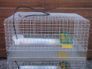 Jednopodlažní klec o rozměru 100 x 54 x 35 cm. Rozměr podlahy je 95 x 41 cm, výška uvnitř klece 27 až 21 cm. Dodávám ve smontovaném stavu, nutné je pouze napojit hadici na vlastní zásobník vody. Klece lze skládat nad sebe, postavit na pevnou podlahu nebo do trávy, ale rovněž zavěsit na stěnu. Dvířka jsou na čelní straně. Klec lze rozdělit vnitřní přepážkou na 2 poloviny ( není součástí klece ). Doporučuji pro 20 křepelek. Napáječka a krmítko jsou před klecí.